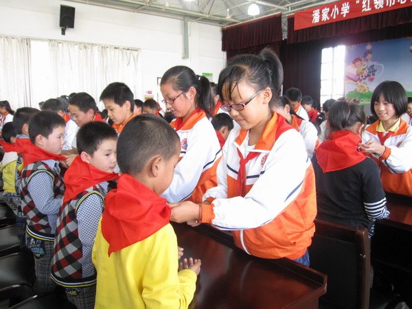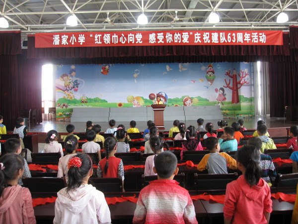 在中国少年先锋队建队63周年来临之际,为落实少先队组织的根本任务,迎接和庆祝党的十八大胜利召开,潘家小学组织全体少先队员,积极开展“红领巾心向党——感受你的爱”全国统一主题队日活动。少先队大队部组织大队委员、优秀少先队员代表,举行座谈会,学习少先队的光荣历史,分享少先队活动的成果。大队委员还分四组来到低年级进行“红领巾心向党”新老队员交流分享活动。