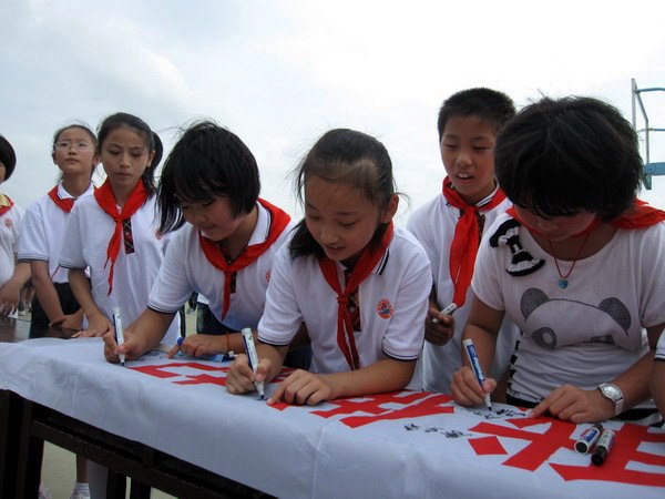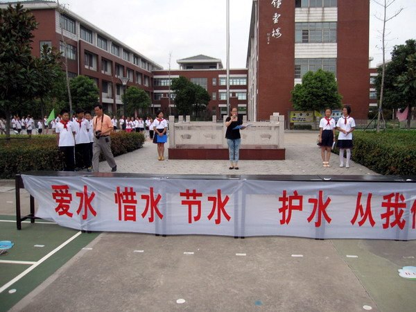 首先,教育处主任周黎洪以《惜水、爱水、节水、护水,从我做起》为题发表重要讲话,要求全体少先队员树立爱水意识,从现在做起,主动劝阻浪费用水现象。接着,副大队长付思嘉向全体少先队员发出倡议,希望大家充分认识校园节水的重要性,加强节约用水的宣传,各尽所能节约用水,及时制止浪费水资源现象。最后,全体少先队员进行“惜水、爱水、节水、护水,从我做起”签名活动,表达了他们人人争当“爱水小天使”的决心。雪堰镇电视台对活动全过程进行了拍摄,还现场采访了付思嘉、马文雯、吴林轩等3位少先队员。