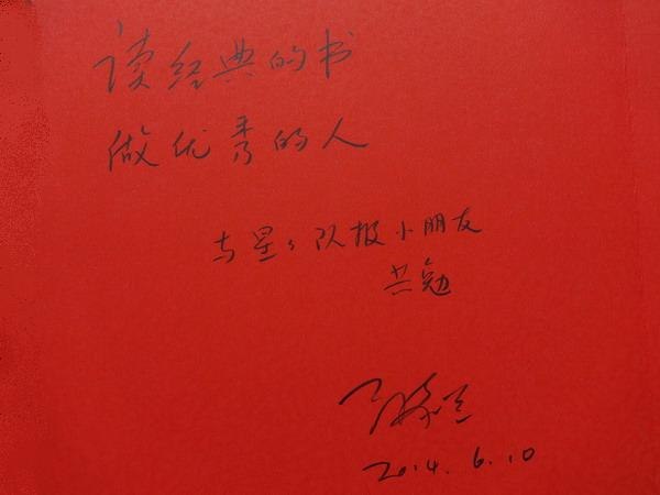 小记者们也抓住这个难得的机会,争先恐后采访汤素兰老师,他们提出了一个个关于读书、写作的问题。汤素兰老师不厌其烦,一一回答,会场气氛和谐热烈,激发了孩子们读书的兴趣,赢得了大家热烈的掌声。得知学校《星星队报》今年创刊25周年了,汤素兰老师还热情题写寄语,勉励《星星队报》小记者:“读经典的书,做优秀的人。”