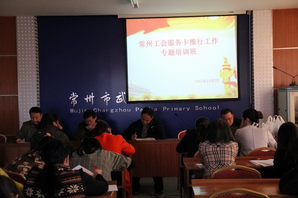 2015年11月2日中午,全体教师集中会议室,举行“常州工会服务卡”推行工作专题培训活动。培训活动由工会主席杨建东副校长主持。