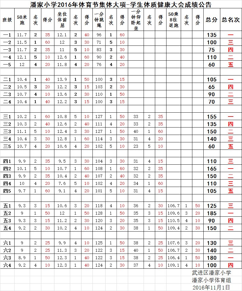 2016年潘家小学体育节集体大项-学生体质健康大会成绩公告